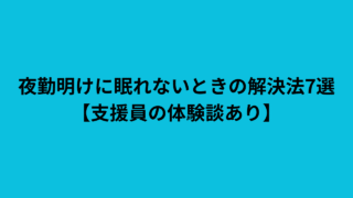 健康・体調管理 夜勤明けに眠れないときの解決法7選【支援員の体験談あり】 はじめに 夜勤が終わって家に帰ったのに、なかなか眠れない…。「疲れているはずなのに目が冴えてしまう」「ベッドに入っても浅い眠りしかできない」──夜勤経験のある人なら、一度は感じたことがある悩みではないでしょうか。 実際、私自身... 2025.09.13 健康・体調管理夜勤生活